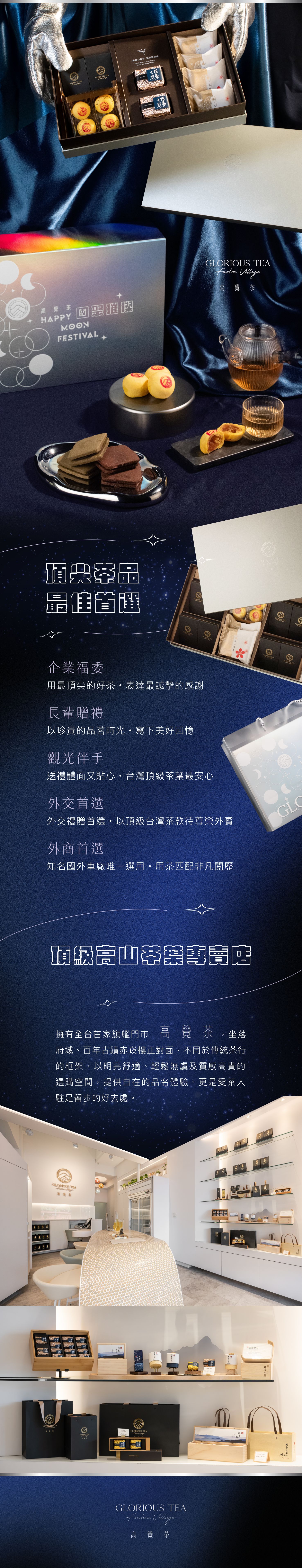 除了選用來自台灣梨山的頂級高山茶葉:梨山北線、梨山行館、佳陽頂峰(特)外,甘甜醇淨的茶香總該來點茶點,台灣在地百年糕餅品牌-郭元益及日系和風美學甜點-七見櫻堂,盼能為您的祝褔注入暖心食光。